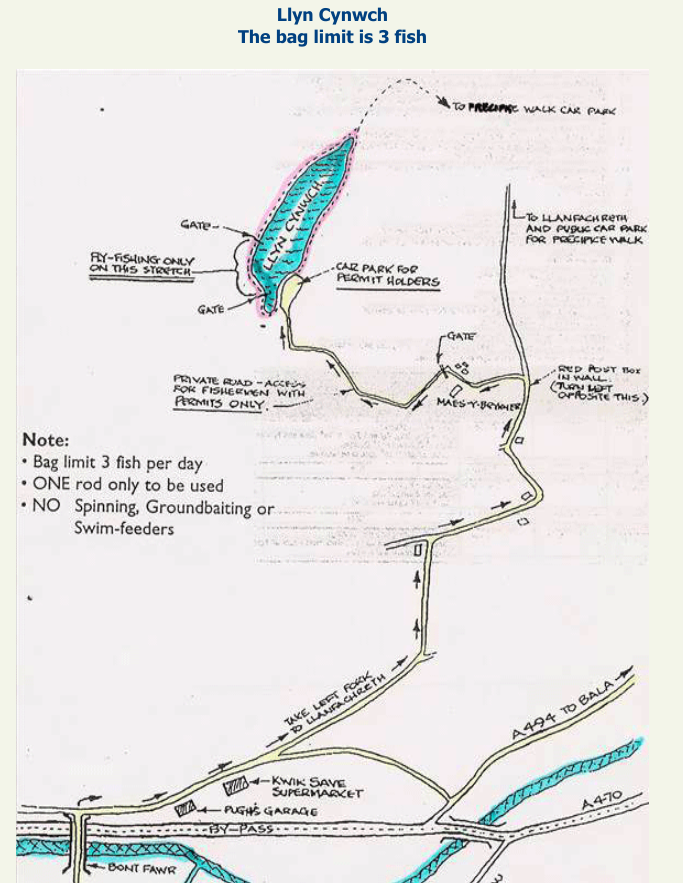 Llyn Cynwch opens on March 1st and closes on October 31st. It is stocked every 2-3 weeks with brown, rainbow and blue trout from the hatchery at Pysgota Prysor at Trawsfynydd. Browns of 6lb and rainbows over 13lb have been recorded here. This is a large tract of clear, cold water which fishes well in the evenings. The whole lake can be fished. There is easy access and parking is also easy as indicated on the map. FLY Only and CATCH and RELEASE.
